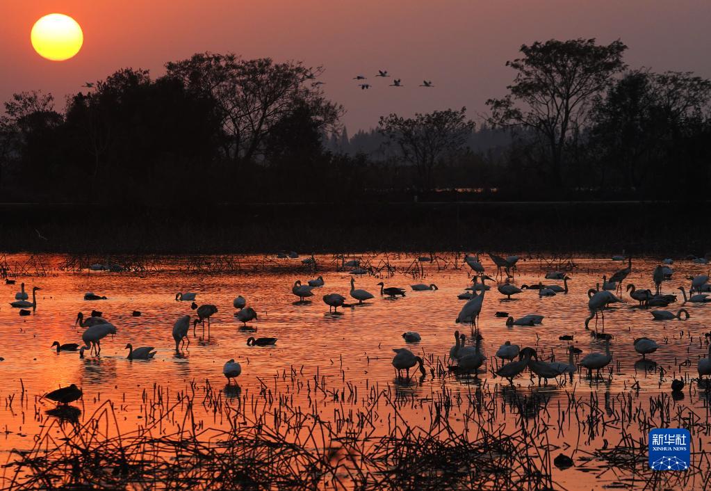 在鄱陽湖畔的五星白鶴保護小區,成百上千只候鳥歡快地嬉戲覓食,享受著鄱陽湖畔的冬日暖陽。鄱陽湖今年遭遇持續干旱,為保護越冬候鳥,愛鳥人士將候鳥常來的藕塘租下來,擴建五星白鶴保護小區,周邊的稻田也只種不收,留給候鳥作食物……這一系列舉措保障了候鳥在此棲息越冬。