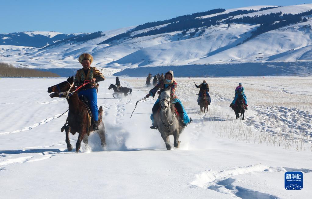 在昭蘇縣薩爾闊布鄉一處雪原上,當地農牧民進行“姑娘追”活動(12月21日攝)。
