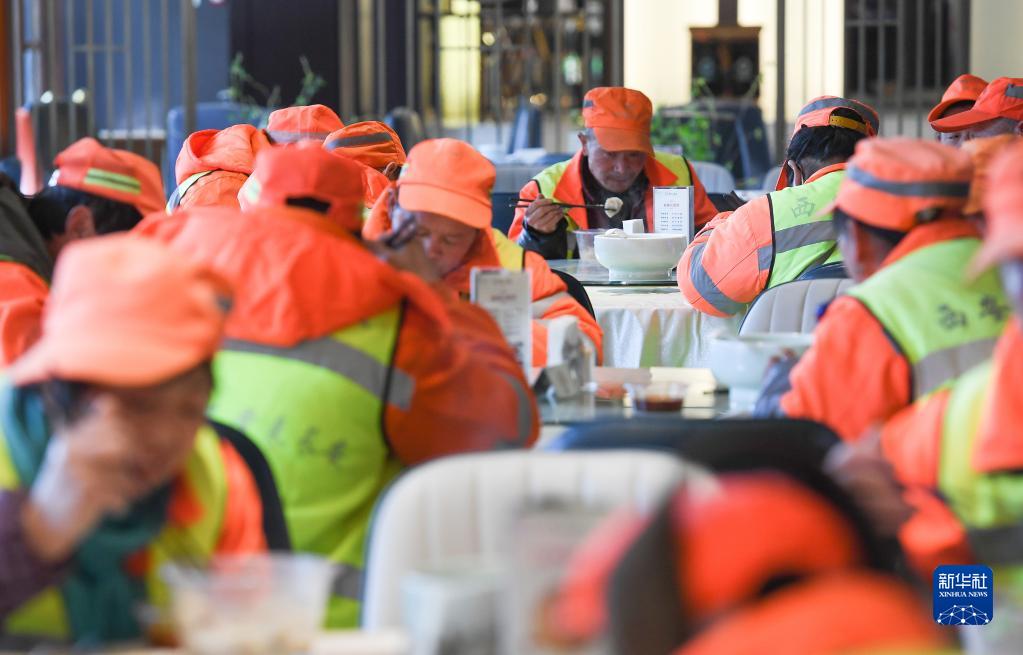 12月22日,環衛工人在西安市新城區一家餐廳吃水餃。