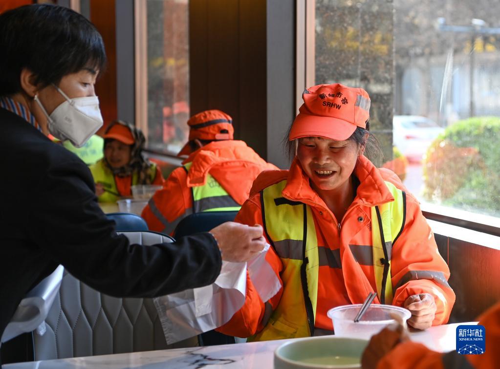 12月22日,西安市新城區一家餐廳的工作人員為環衛工人送上打包袋。