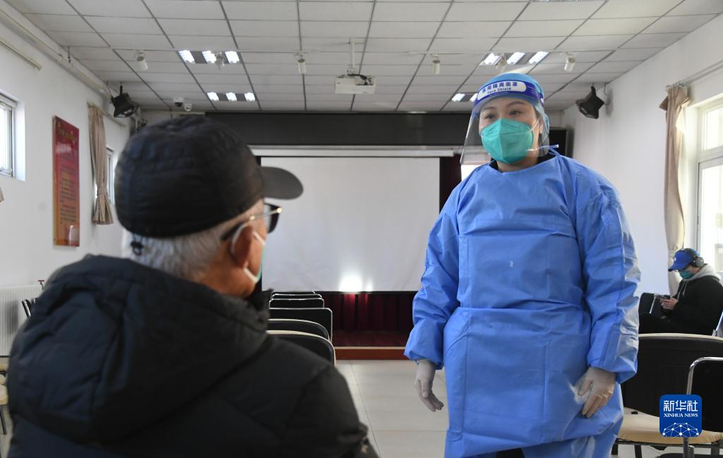 12月22日,在北京市海淀區東升鎮新冠疫苗接種點,醫護人員在留觀區詢問市民接種吸入式新冠疫苗后的身體情況。