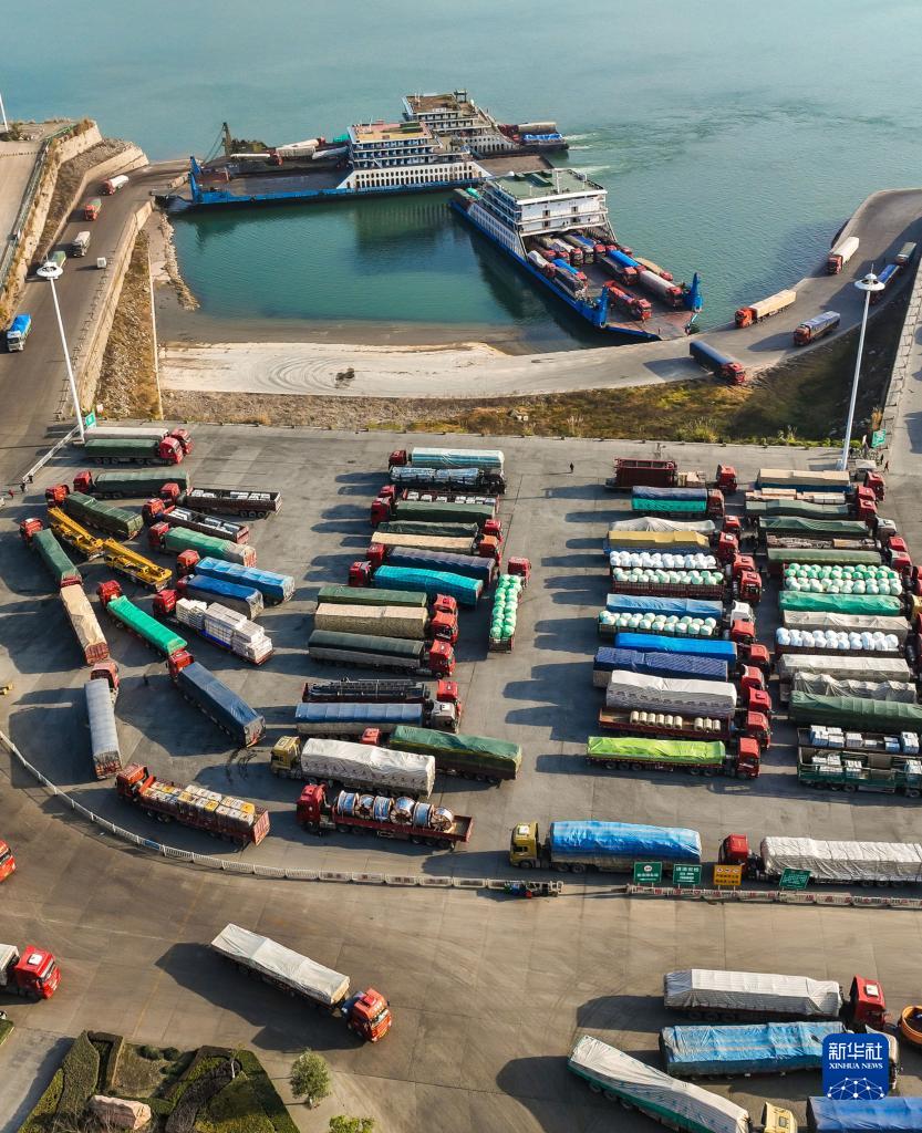 12月22日,大型貨車(chē)在三峽大壩上游湖北省宜昌市秭歸縣銀杏沱滾裝碼頭上、下船(無(wú)人機(jī)照片)。