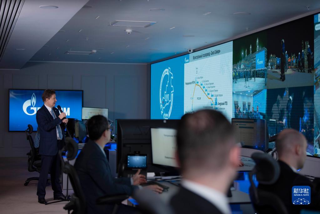 12月21日,在俄羅斯圣彼得堡,俄羅斯天然氣工業公司總裁米勒(左一)在科維克塔天然氣氣田和“科維克塔—恰揚達”天然氣管道投產通氣儀式上與俄羅斯總統普京(未見于畫面)和氣田現場進行視頻連線。