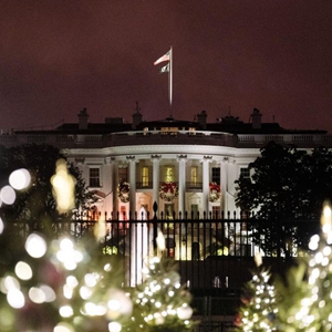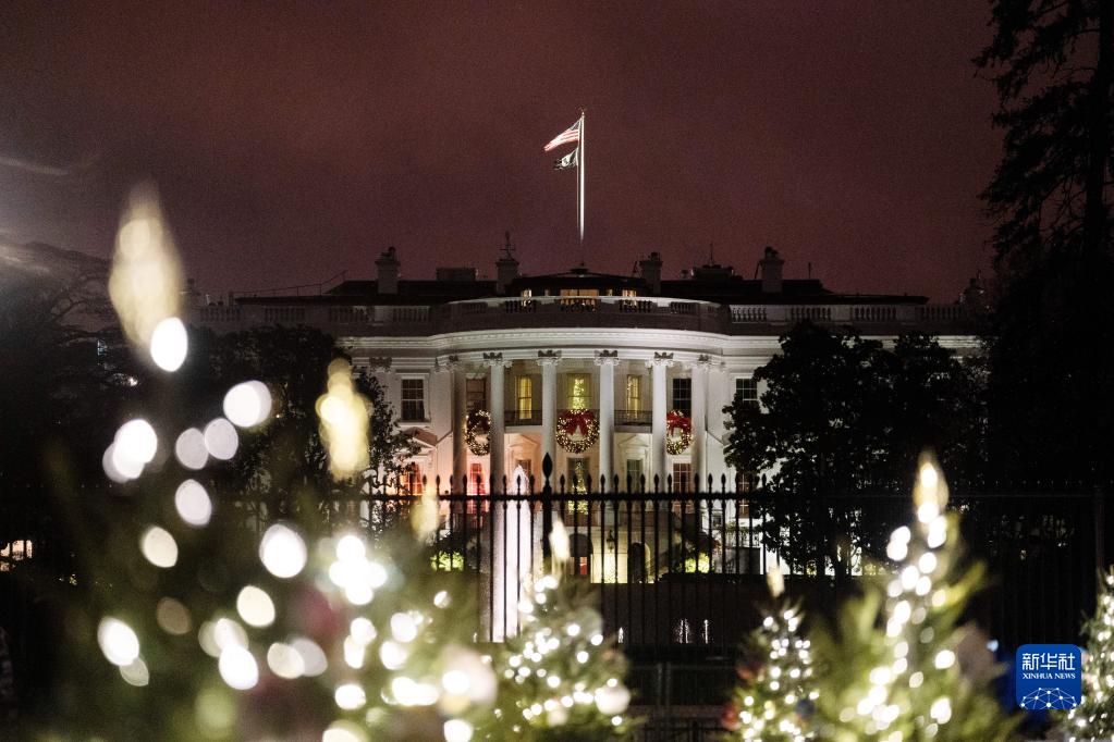 這是12月22日在美國華盛頓拍攝的圣誕樹裝飾掩映下的白宮。