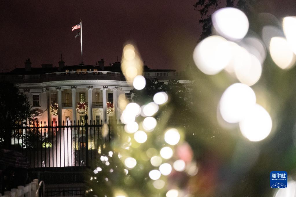 這是12月22日在美國華盛頓拍攝的圣誕樹裝飾掩映下的白宮。