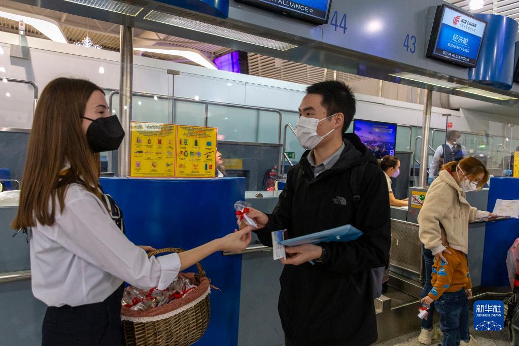 12月22日,在希臘雅典國際機場,機場工作人員向旅客派送甜點禮物。