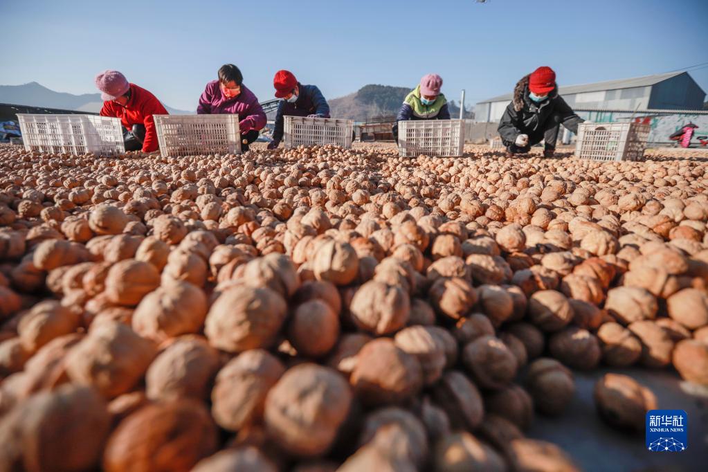 12月23日,農民在遵化市東舊寨鎮石橋頭村一家核桃專業合作社的場院精選核桃。