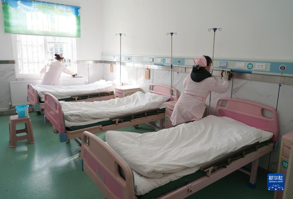 12月22日,在周至縣馬召鎮中心衛生院內,護士在為患者預留的床位邊進行清潔工作。