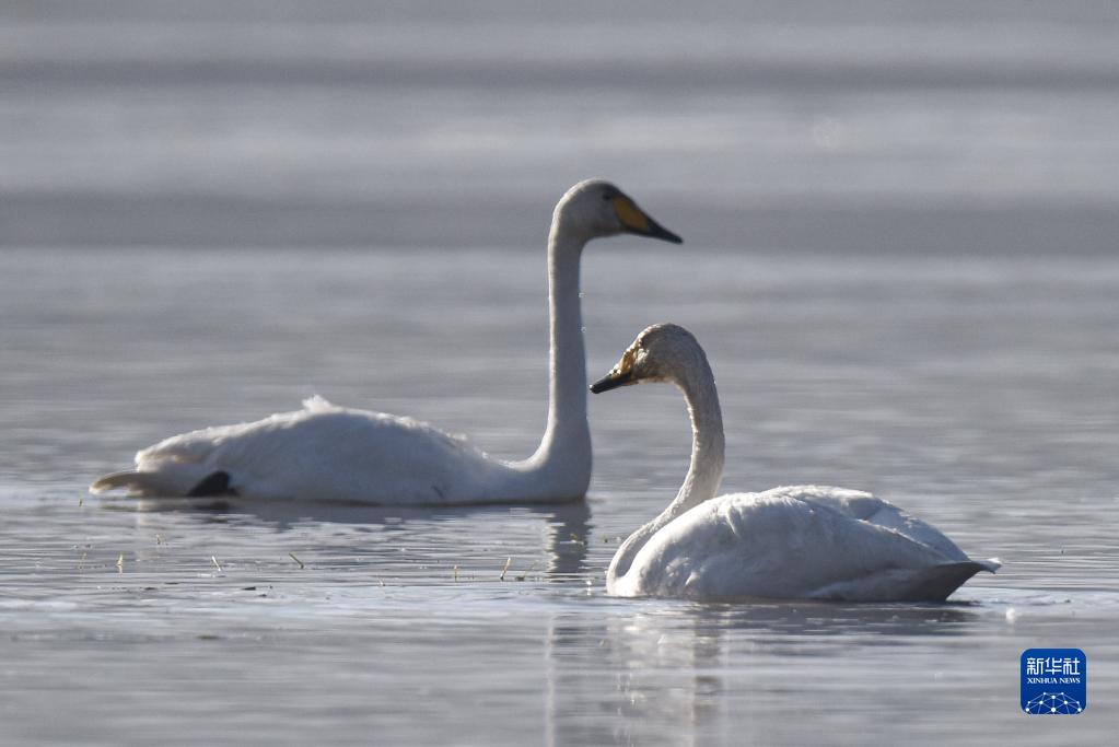 12月23日,大天鵝在青海省化隆回族自治縣群科鎮(zhèn)的黃河水面上休憩覓食。