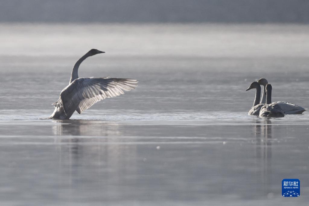 近日,青海省海東市化隆回族自治縣群科鎮的黃河上迎來近百只越冬的大天鵝,為冬日高原增添了一抹生機。
