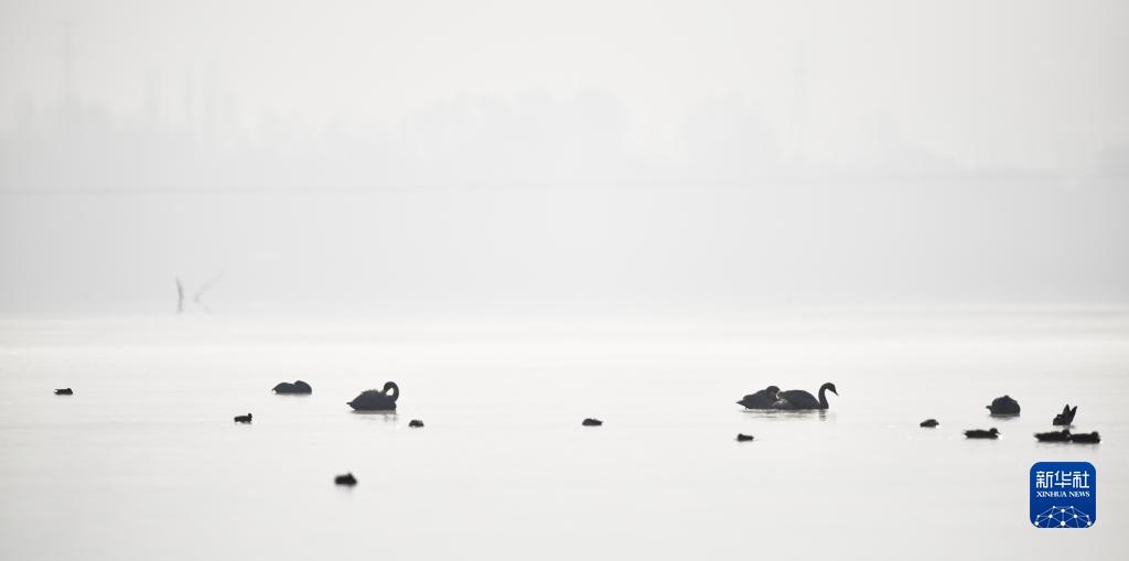 12月23日,大天鵝在青海省化隆回族自治縣群科鎮(zhèn)的黃河水面上休憩覓食。