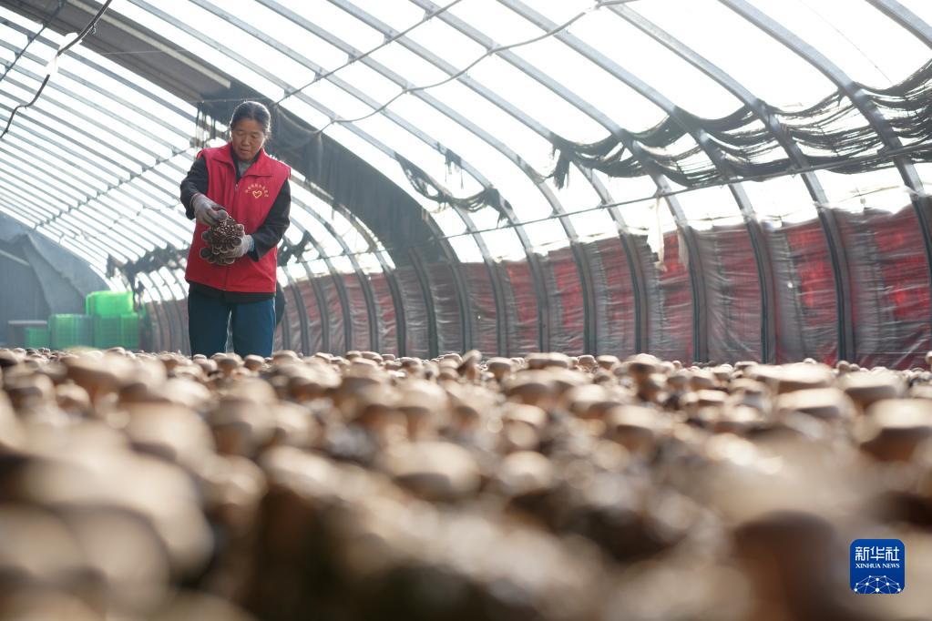 12月23日,內丘縣下馬莊村村民在大棚里采摘香菇。