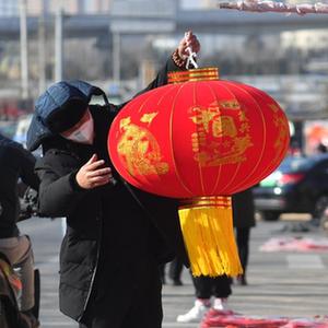 12月24日,在山東省青島市城陽區流亭街道雙埠年貨大集上,一名對聯經銷攤主向顧客展示福字。