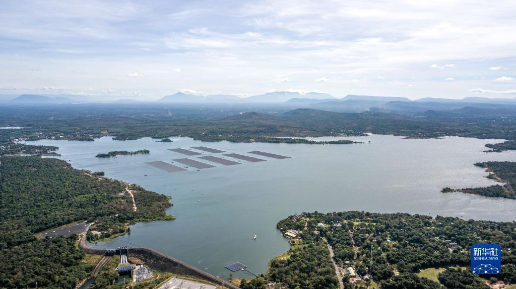 這是12月8日在泰國烏汶府詩琳通水庫拍攝的浮體光伏項目(無人機照片)。