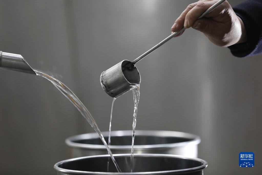 12月16日,工人在寶豐縣邢莊村一釀酒車間查看白酒品質。