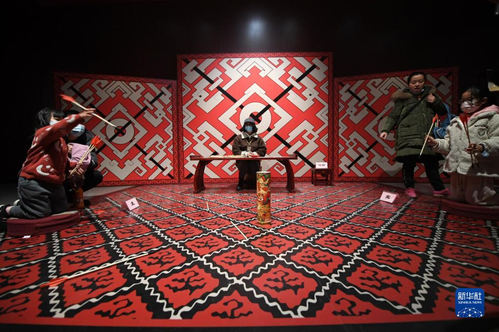 2022年2月10日,長沙博物館開展投壺體驗活動,吸引不少小朋友參與到這一傳統游戲當中。投壺即“投箭入壺”,是一種古代宴飲的投擲游戲。