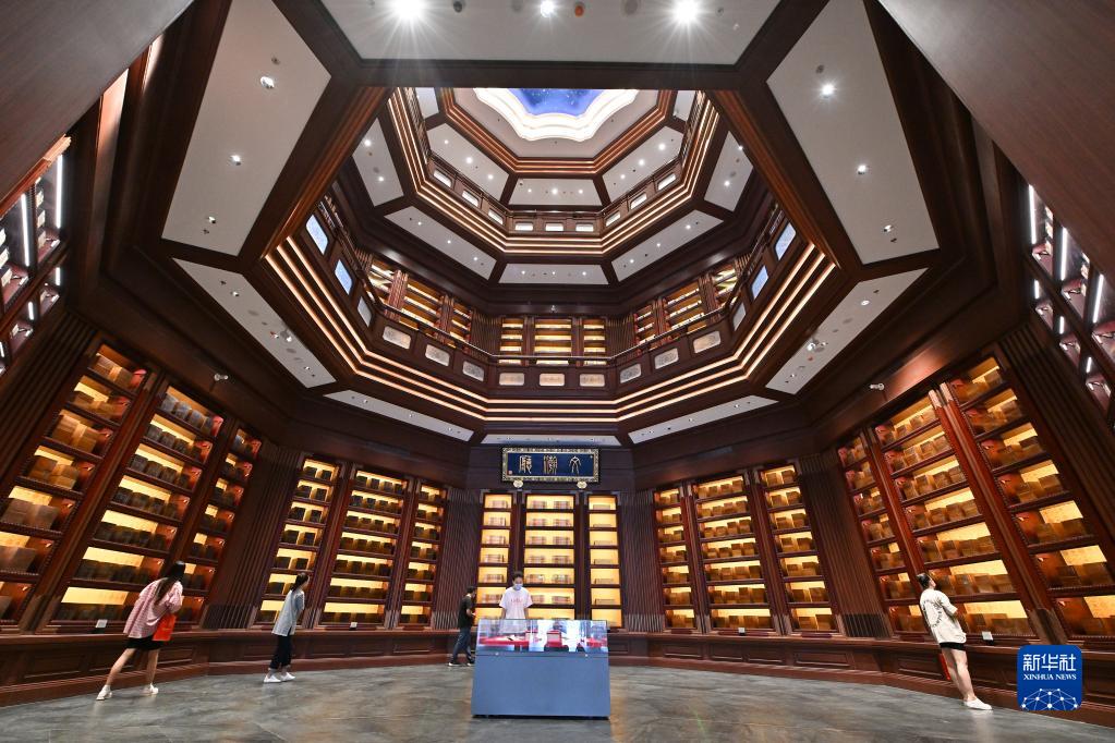 2022年7月30日,觀眾在中國國家版本館中央總館文瀚廳內參觀。中國國家版本館是國家版本資源總庫和中華文化種子基因庫,由中央總館文瀚閣、西安分館文濟閣、杭州分館文潤閣、廣州分館文沁閣組成,歷時三年建設,全面履行國家版本資源保藏傳承的職責。