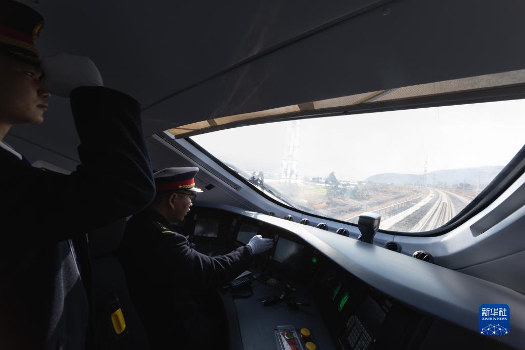 12月26日,列車駕駛員姜海亮(右)、廖俊杰駕駛新成昆鐵路首發列車。