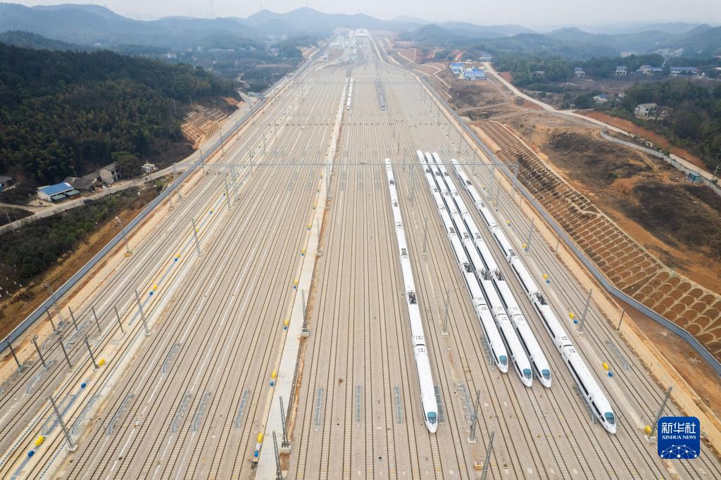 12月26日,列車準備進入渝廈高鐵長沙西動車運用所保養、檢修(無人機照片)。