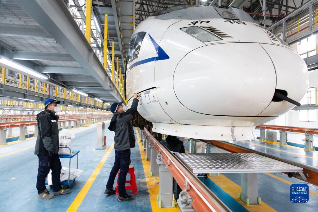 12月26日,工作人員在渝廈高鐵長(zhǎng)沙西動(dòng)車運(yùn)用所6線檢查庫(kù)對(duì)停放的列車進(jìn)行保養(yǎng)。
