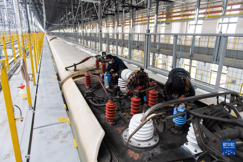 12月26日,工作人員在渝廈高鐵長沙西動車運用所6線檢查庫對停放的列車進行保養。
