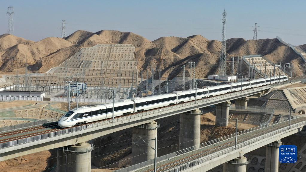 12月26日,一趟試運行動車組列車在銀蘭高鐵上行駛(無人機照片)。