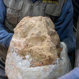 12月3日,考古隊員在提取頭骨化石。
