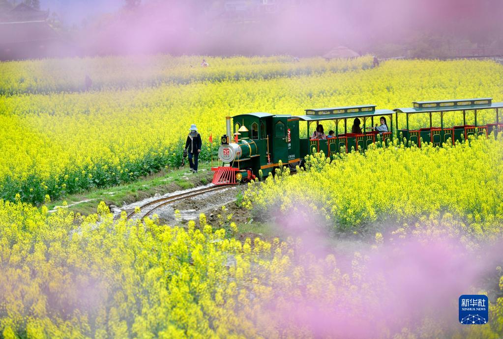 游客乘坐“小火車”在湖北省恩施土家族苗族自治州宣恩縣的油菜花田中欣賞春光(2022年3月18日攝)。