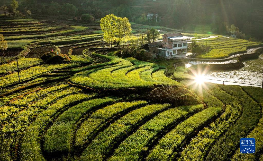 這是晨曦下的陜西省安康市漢陰縣漩渦鎮堰坪村古梯田春景(2022年4月3日攝,無人機照片)。