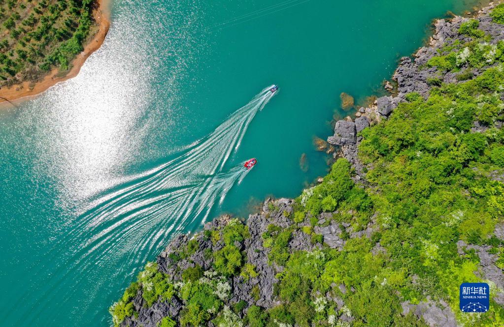 這是在湖南省永州市道縣壽雁鎮樂海水庫拍攝的春景(2022年4月21日攝,無人機照片)。