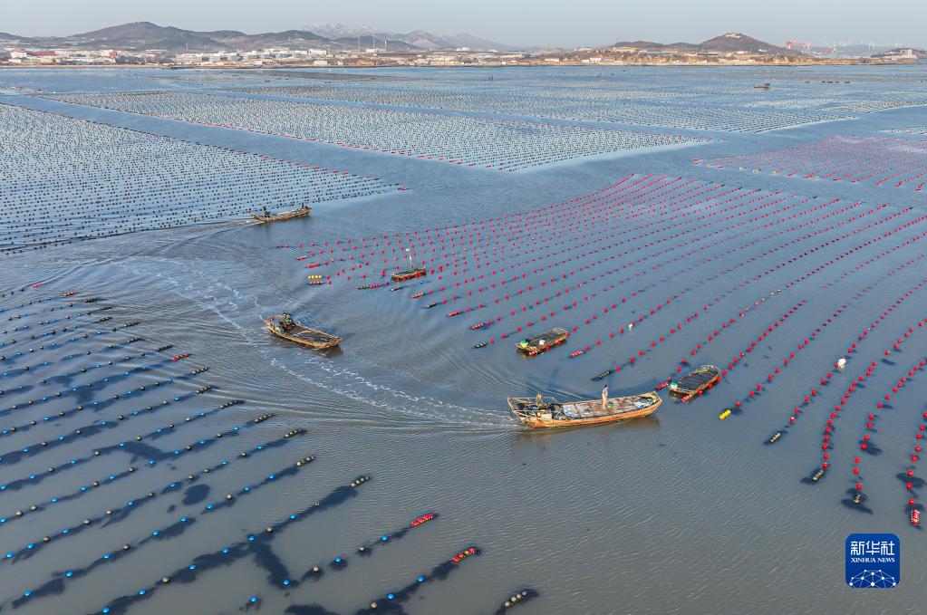 目前,山東省榮成市各大海洋牧場貝類、藻類養殖正處于冬季管護期,漁民們駕駛漁船在海面上穿梭,進行添加養殖浮漂、清理海草及投喂餌料等作業,呈現出一派“海上冬耕”生產的繁忙景象。