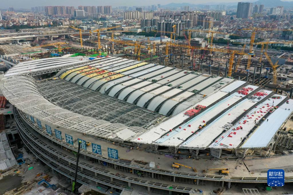 廣州白云火車站項目一期金屬屋面和二期主體結構建設現場(無人機照片,12月27日攝)。