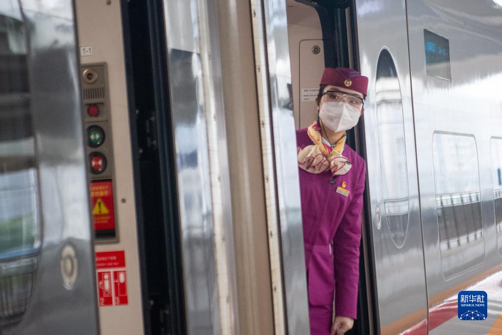 12月27日,在重慶北站G8612次成渝城際高鐵“復(fù)興號”智能動車組車廂內(nèi),工作人員等待發(fā)車。