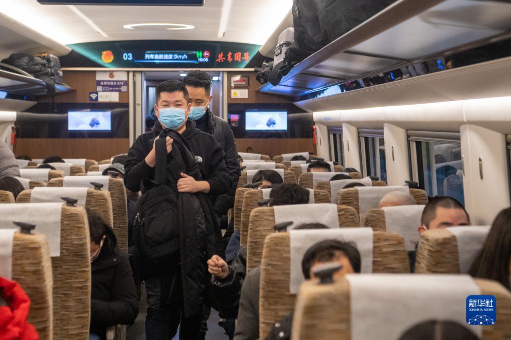 12月27日,在重慶北站即將發車的G8612次成渝城際高鐵“復興號”智能動車組車廂內,乘客準備入座。