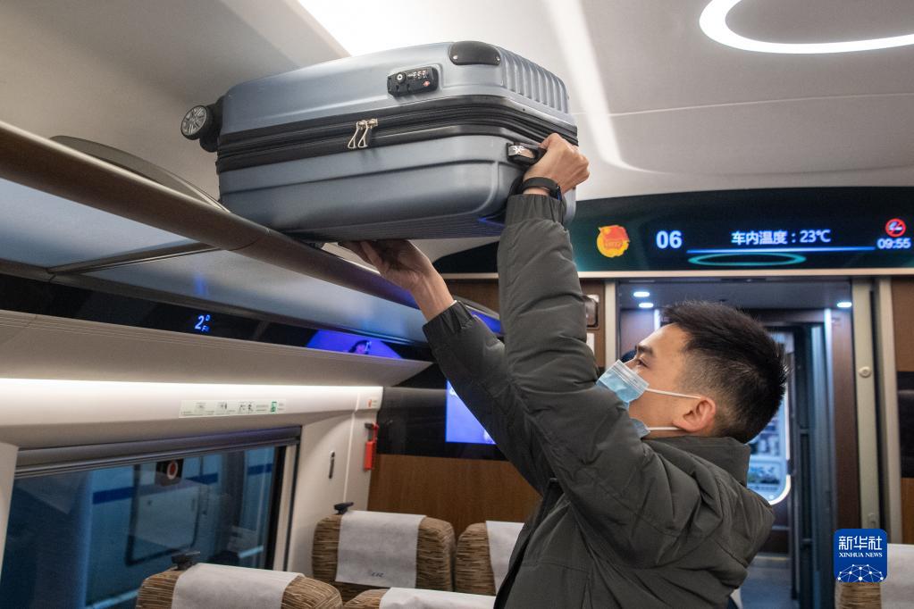12月27日,在重慶北站即將發車的G8612次成渝城際高鐵“復興號”智能動車組車廂內,乘客整理行李。