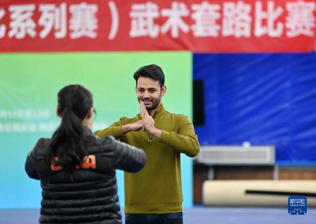 在天津市西青區(qū)精武鎮(zhèn)精武會(huì)館,穆罕默德·納比爾(右)和霍靜虹一起練習(xí)“霍氏練手拳”(12月25日攝)。