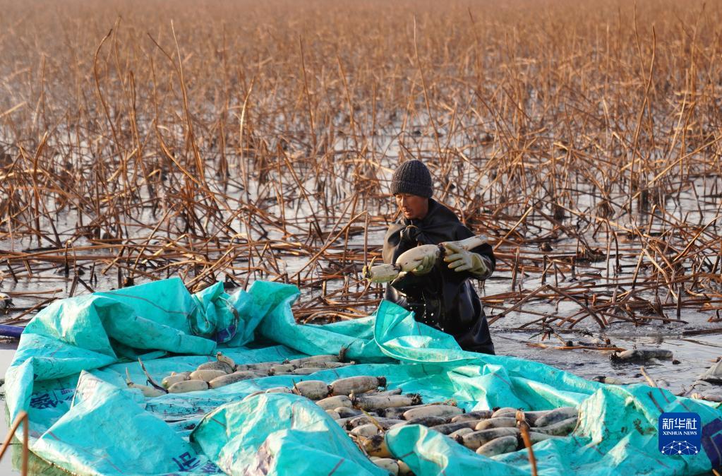 12月28日,農(nóng)民在新河縣新河鎮(zhèn)白穴口村蓮藕種植基地冒著嚴寒采挖蓮藕。