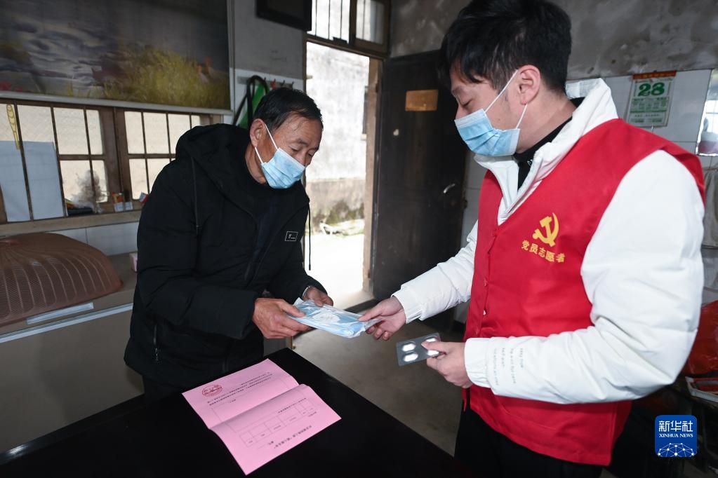 12月28日,黨員志愿者上門給織里鎮(zhèn)驥村村低保戶謝金春(左)送“健康包”。