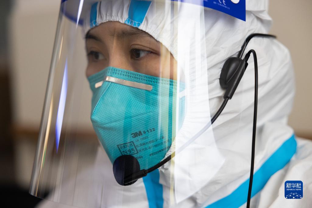 12月27日,在上海交通大學醫學院附屬新華醫院兒科發熱門診預檢臺前,頭戴話筒的護士在回答家長提問。