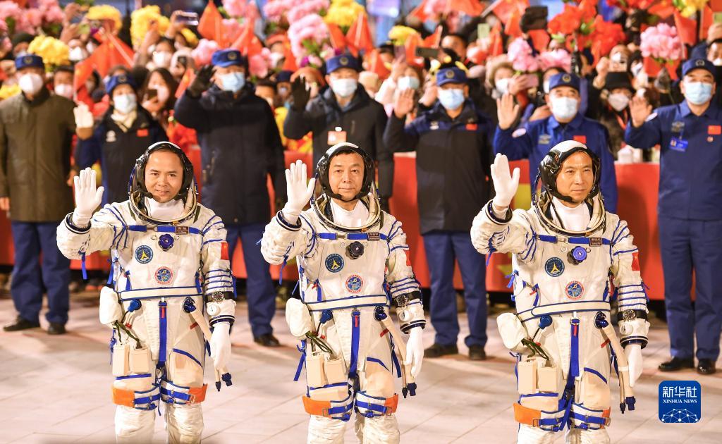 11月29日20時(shí)18分,神舟十五號載人飛行任務(wù)航天員乘組出征儀式在酒泉衛(wèi)星發(fā)射中心問天閣圓夢園廣場舉行。航天員費(fèi)俊龍(右)、鄧清明(中)、張陸在出征儀式上。 新華社記者 劉磊 攝