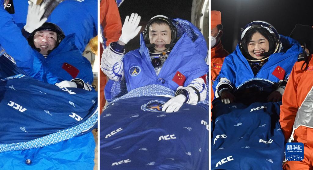 12月4日,神舟十四號載人飛船返回艙在東風著陸場成功著陸。這是航天員陳冬(中)、劉洋(右)、蔡旭哲安全順利出艙(拼版照片)。 新華社發