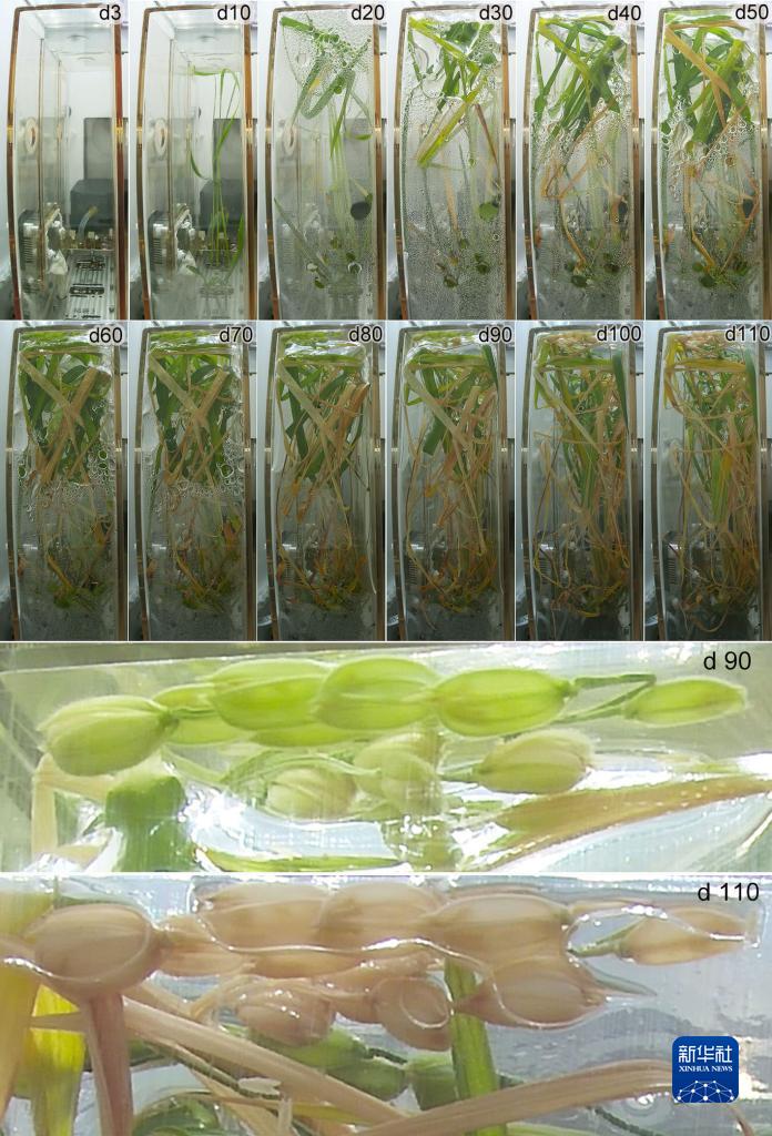 這是水稻在問天艙生命生態實驗柜通用生物培養模塊中完成“從種子到種子”全生命周期不同發育階段的代表性圖片,圖像上的數字表示注入營養液啟動實驗后的天數。隨著圓滿完成神舟十四號載人飛行任務的3位航天員平安歸來,經歷了120天全生命周期的水稻和擬南芥種子,也一起搭乘飛船返回艙從太空歸來。我國在國際上首次完成水稻“從種子到種子”全生命周期空間培養實驗。 新華社發