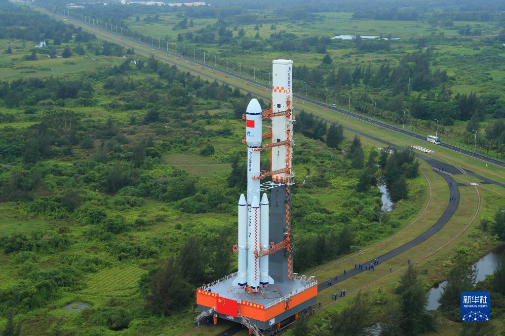 5月7日,天舟四號貨運飛船與長征七號遙五運載火箭組合體在垂直轉(zhuǎn)運?!⌒氯A社發(fā)(楊志遠 攝)