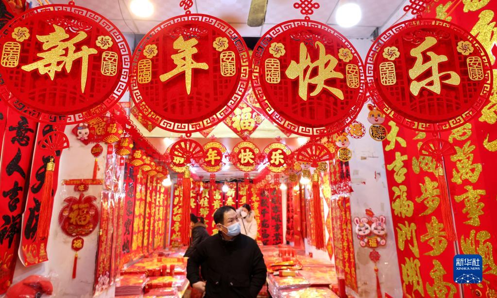 12月29日,在山東省棗莊市一處年貨市場內,人們選購新年飾品。