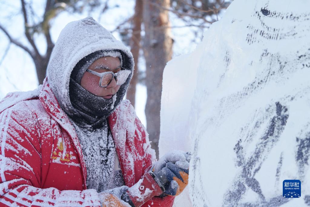 12月29日,參賽選手在進行冰雕創作。