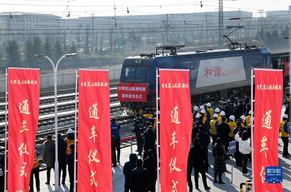 12月29日,在日照嵐山疏港鐵路山鋼站,首列貨運列車經過通車儀式現場。