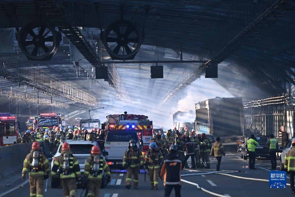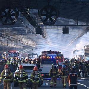 12月29日,消防人員在韓國京畿道果川第二京仁高速公路發生火災的隔音隧道內工作。