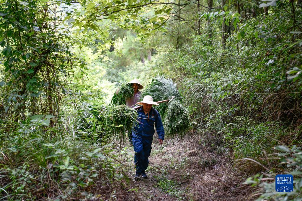 劉開福(前)與村民搬運投喂螞蚱所需的草料(2022年8月3日攝)。