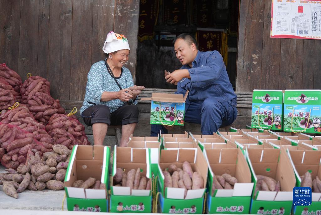 劉開福(右)與村民在分揀紫薯(2022年11月9日攝)。