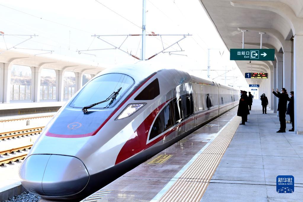 12月30日,在濟(jì)(南)萊(蕪)高鐵雪野站,復(fù)興號(hào)列車駛出站臺(tái)。